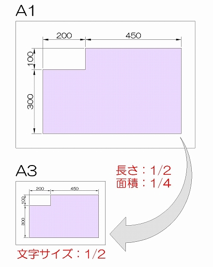 A1からA3に図面を縮小すると、縮尺が1/2になる訳ですから、文字のサイズも同じく1/2になります。
